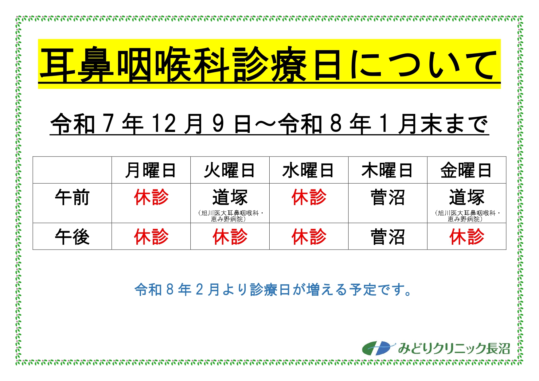 耳鼻咽喉科診療体制変更について